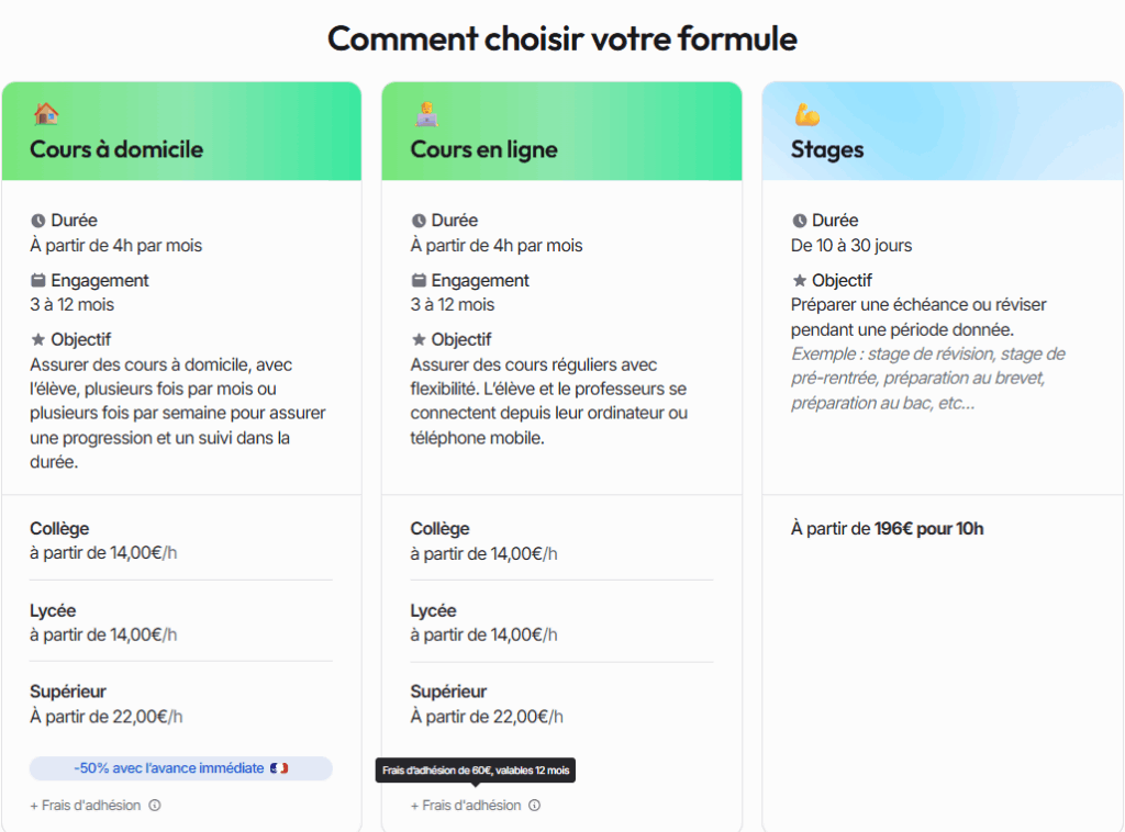 En cours en ligne et à domicile, les tarifs s’appliquent à partir de 4h/mois, avec engagement de 3 à 12 mois, de 14 €/h à 22 €/h du collège au supérieur.